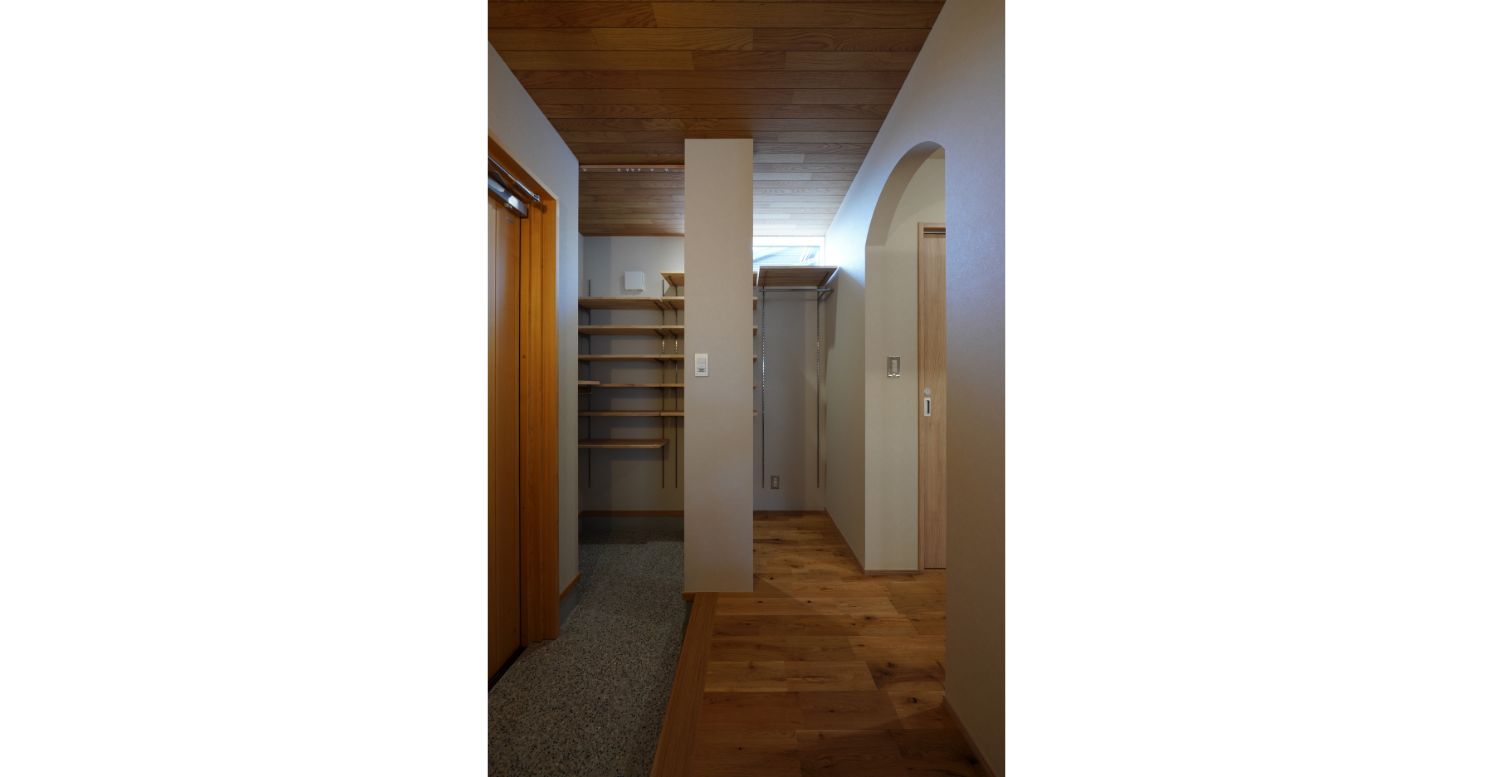 ひとつは家族が集うLDKへ、もうひとつは水回りへと続く動線。