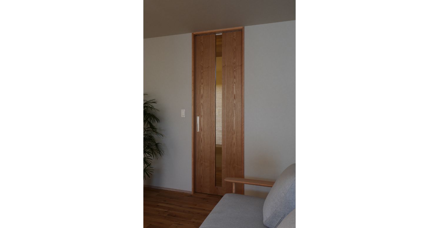 LDKへとつながる引き戸は、空間に合わせて仕立てた造作建具。